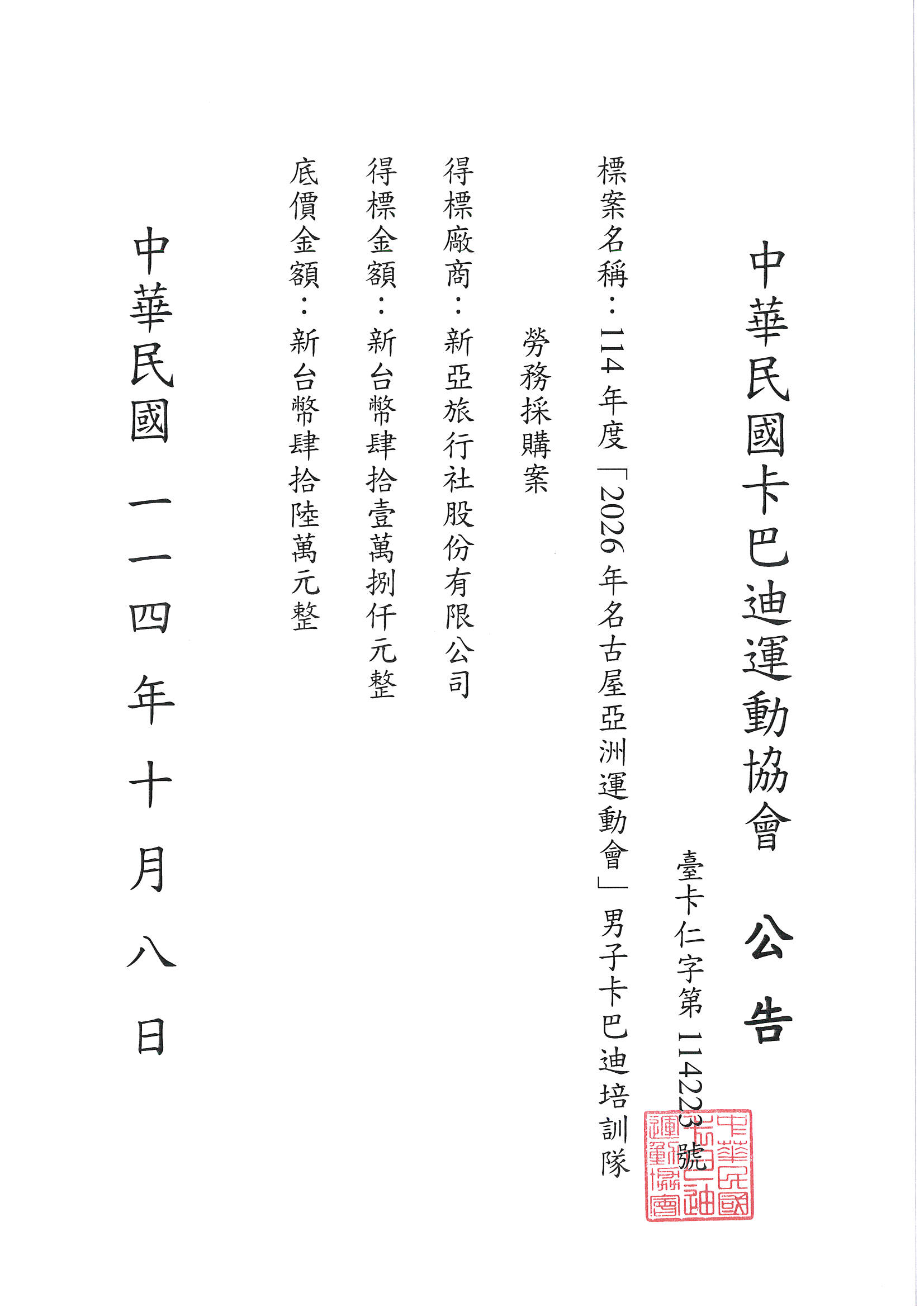 運動部成立(中華民國114學年度總統盃全國卡巴迪錦標賽)