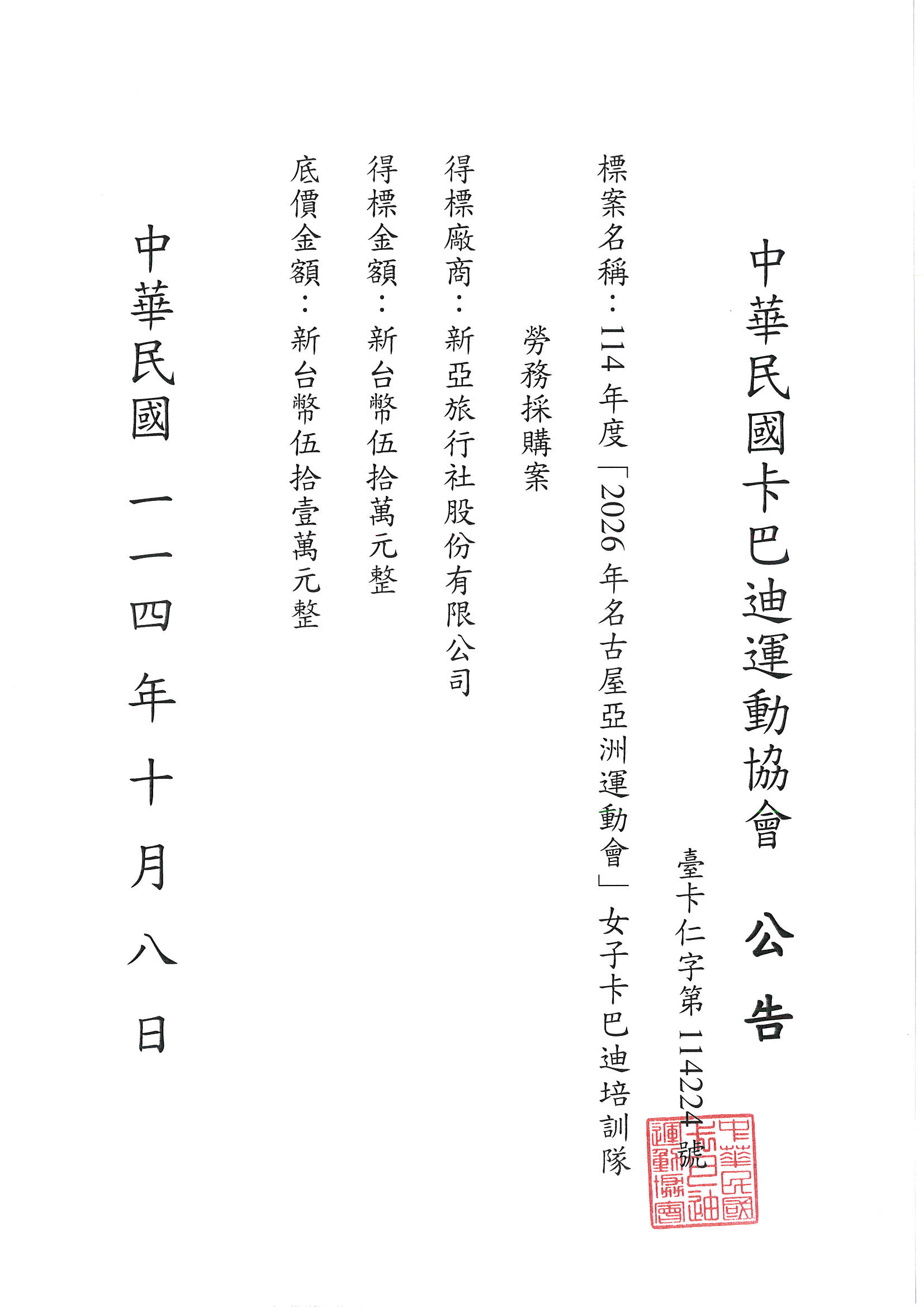 運動部成立(中華民國114學年度總統盃全國卡巴迪錦標賽)